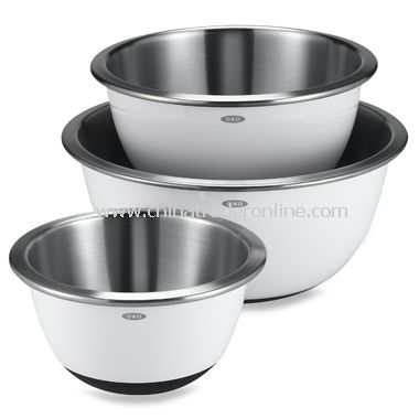 Description: This durable mixing bowl set has a stainless steel interior that won't stain or retain odors, while the white plastic exterior shields hands from extreme temperatures. Non-skid bottoms stabilize bowls... -