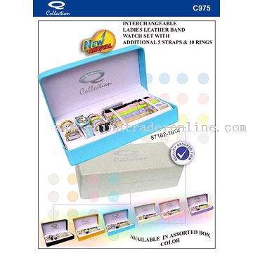 Description: Features: 1) Alloy case: leather band watch gift set 2) Case color: PNP, TT 3) 3-hand analog 4) Japan movement 5) Water resistant 6) Solid stainless steel back 7) Combination of changeable ... -