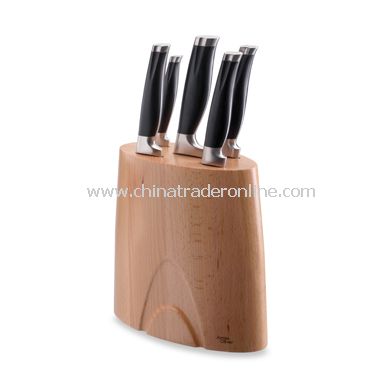 Knife has it's name on the end of the handle so you can easily identify it in the knife block. Dishwasher safe. 25-year warranty. Set includes 4" parer, 7 1/'2" chef's knife, 6" utility knife, 8 1/2" bread knife, 8" carving knife and knife block for storage.