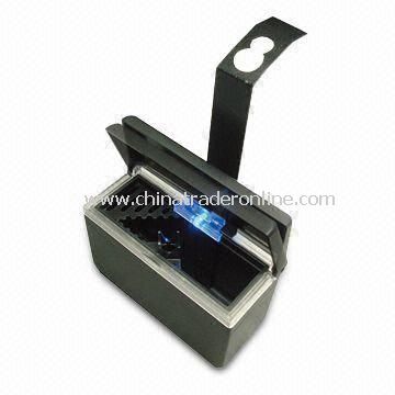 Description: Materials: ABS, PC and iron can Colors: sliver and iron gray Function: used in car, fixed on bottle carriers LEDs (blue color) powered by solar panels Unit size: 75 x 85 x 110mm Unit weigh...Car Ashtray, Measures 56 x 36 x 35mm, Available in